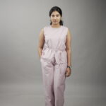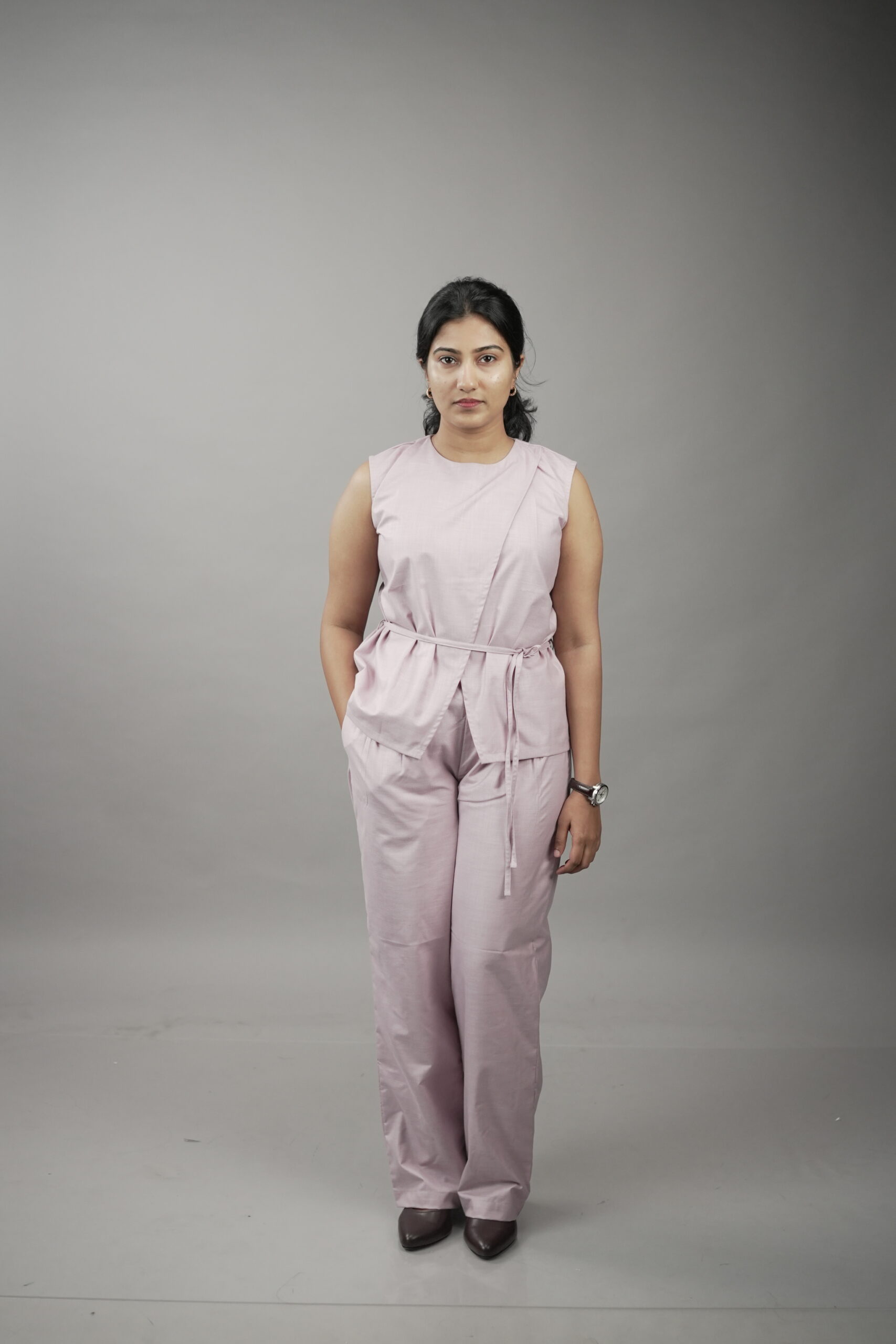 This soft pink co-ord set is designed with an asymmetric front overlap and an adjustable side tie-up that adds gentle structure to a relaxed silhouette. The sleeveless top offers ease of movement, while the straight-cut pants keep the look effortless and balanced. Crafted in breathable cotton, this set is ideal for warm days and unhurried moments.