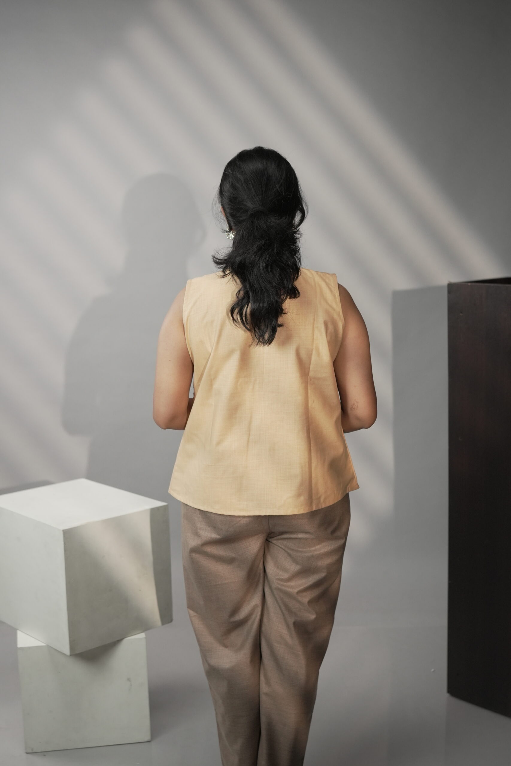 The gently gathered silhouette offers a relaxed, flattering fit, making it ideal for long workdays or slow weekends. Its warm sun-washed hue pairs effortlessly with neutral trousers, linen pants, or skirts, making it a versatile essential for a conscious wardrobe.